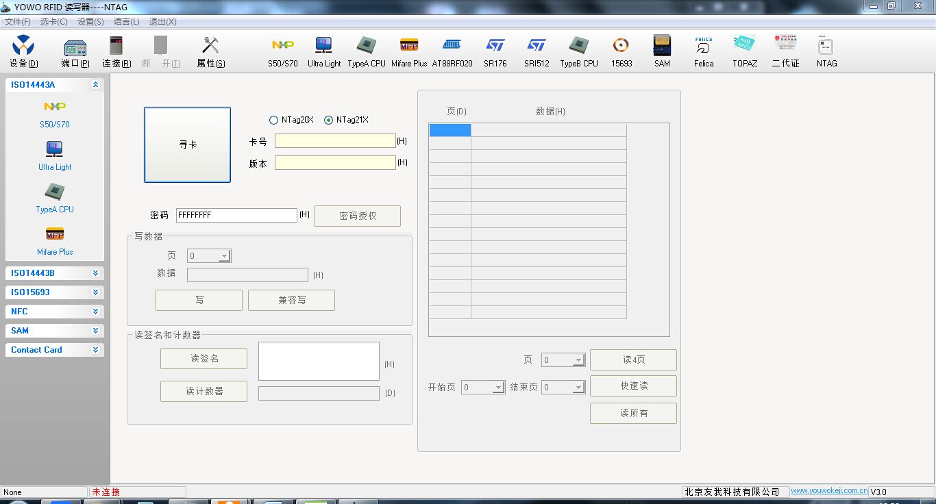 NTAG读写器YW-607完全支持所有的NTAG的射频接口的读写,关于NTAG的演示程序如下图所示: