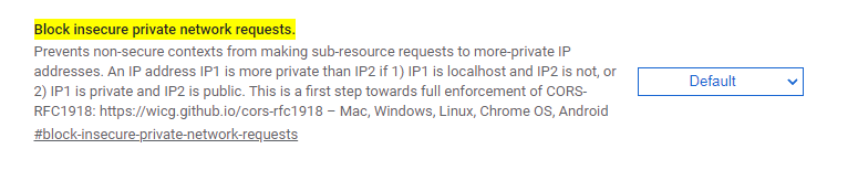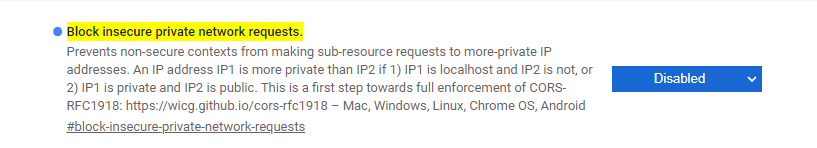 在地址栏输入如下: chrome://flags/#block-insecure-private-network-requests 出现如下界面: