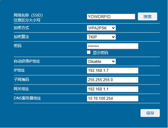 在网络名称处点击搜索选择要连接的wifi名称,输入对应的密码。IP地址为在当前wifi下的IP,默认为192.168.1.7,端口号码默认 23。